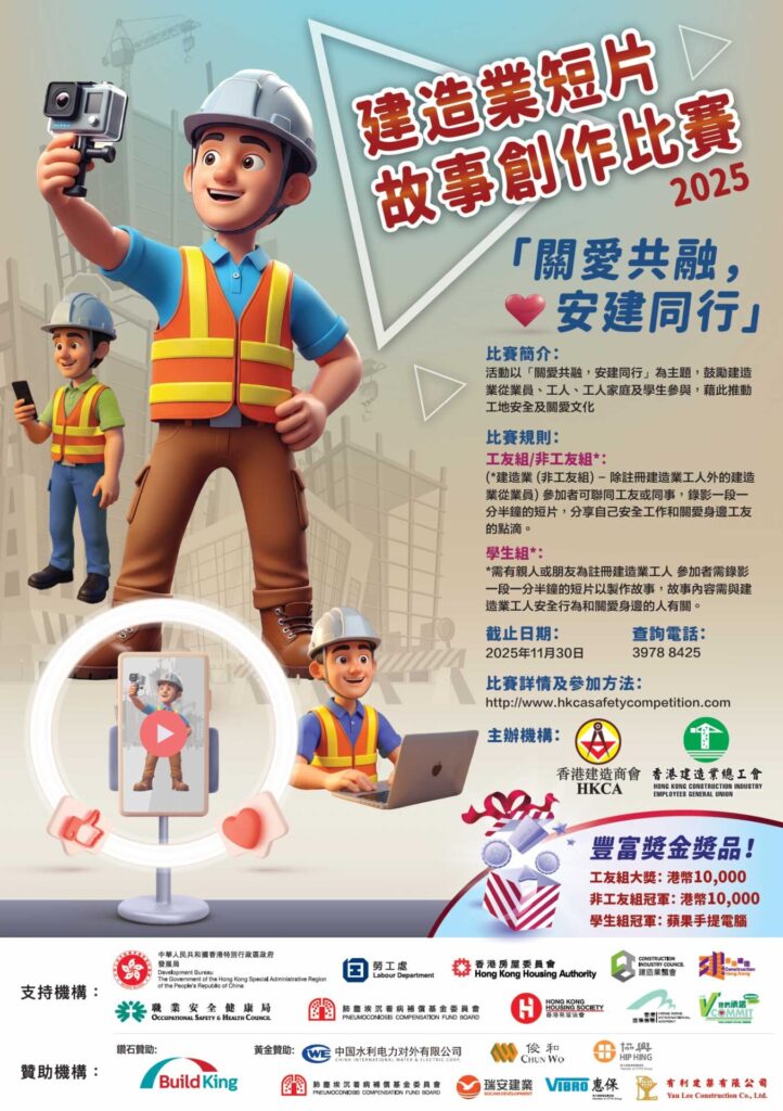 Continuing the great success of Four Cell story competition, the Hong Kong Construction Association together with the Hong Kong Construction Industry Employees General Union are excited to launch the safety promotion campaign – 2025 Construction Short Video Story Competition to raise safety awareness, promote safety behavior and encourage positive action for site safety.
